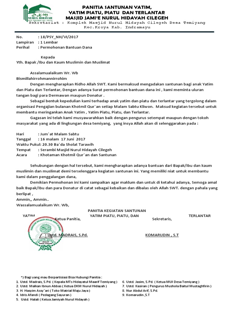 Surat Permohonan Bantuan Dana Untuk Yatim Dan Piatu